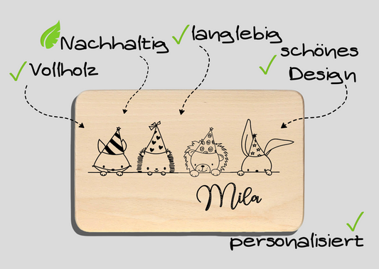 Mach den Frühstückstisch zu etwas ganz Besonderem mit unseren personalisierbaren Frühstücksbrettern für Kinder. Jedes Brett kann mit einem Namen oder einer individuellen Gravur versehen werden und ist damit das perfekte Accessoire für kleine Feinschmecker. Unsere Frühstücksbretter aus Holz sind nicht nur robust und langlebig, sondern auch aus naturbelassenem Material gefertigt – perfekt für eine nachhaltige und umweltfreundliche Wahl.