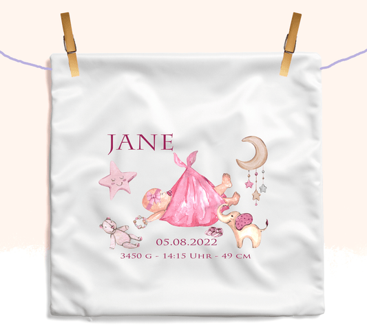 Kissen-Bezug personalisiert zur Geburt mit Elefant - Geburtskissen mit Geburtsdaten - Namenskissen Geschenk Geburt Baby Mädchen