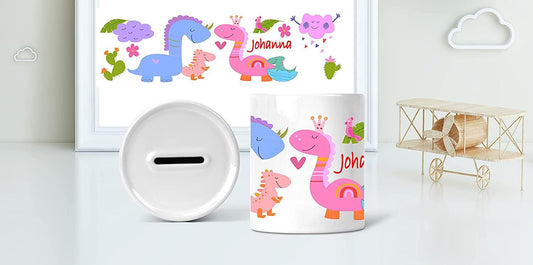 Geschenk-Idee Spardose Mädchen mit Dinosaurier & personalisiert mit Namen - Sparbüchse Sparschwein - Einschulung Teenager