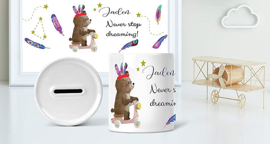 - Personalisierbar: Verleihe jeder Spardose eine persönliche Note mit dem Namen des Kindes oder einem Datum – für ein Geschenk, das ganz individuell auf den kleinen Sparer abgestimmt ist.