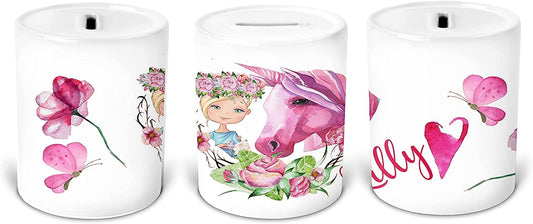 Spardose mit Einhorn für Mädchen personalisiert mit Name - Sparbüchse zum Öffnen - Geschenk-Idee Einschulung Geburtstag
