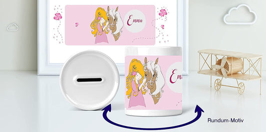 Spardose mit Pferd für Mädchen personalisiert mit Name - Geschenk-Idee Einschulung Geburtstag - Sparbüchse zum Öffnen